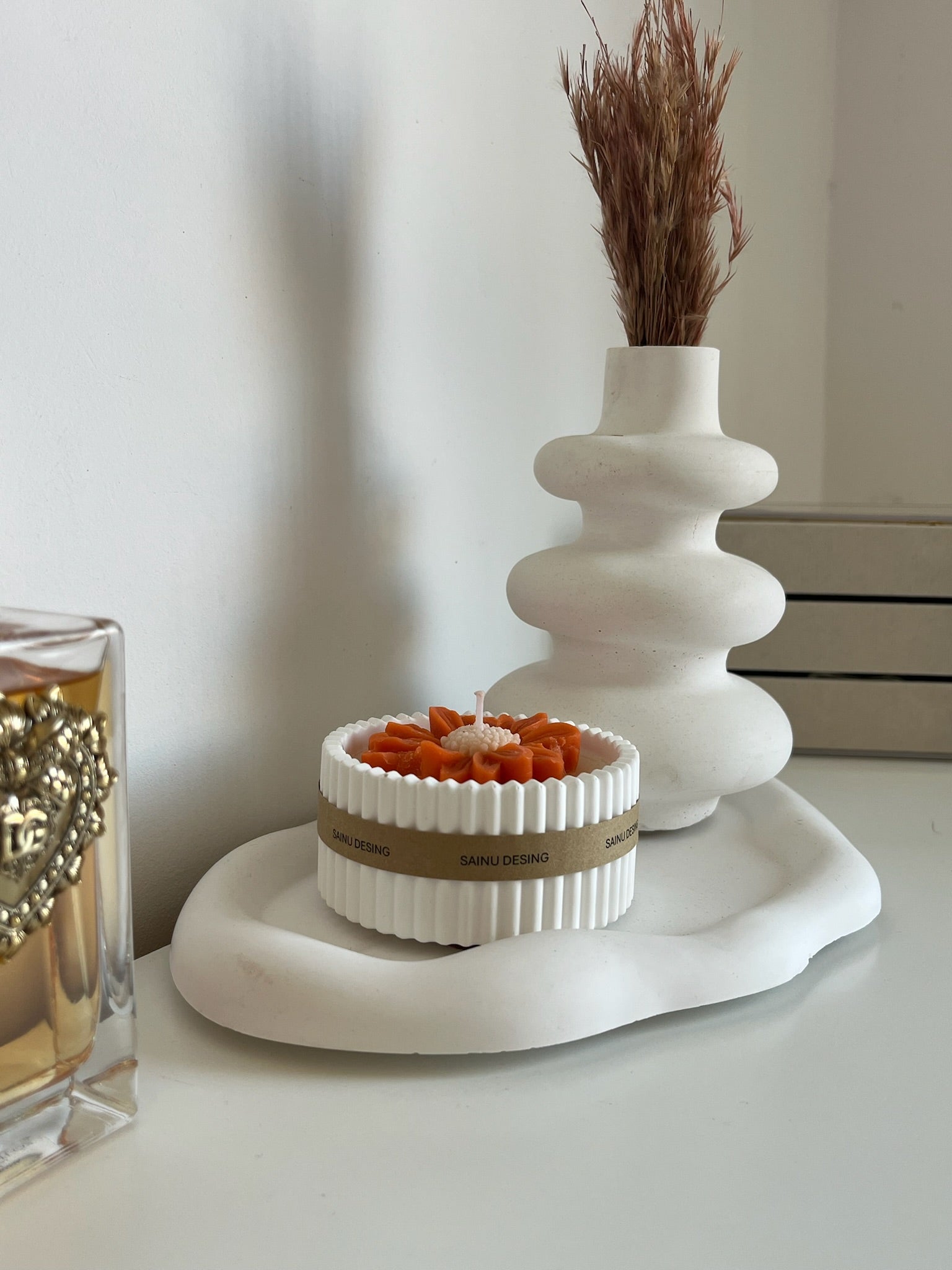 Este conjunto reúne tres piezas que, juntas, crean un ambiente sereno y sofisticado. La bandeja Aura, con su diseño delicado y acabado en resina ecológica, es perfecta para organizar tus objetos favoritos o para servir como base elegante para la vela Margarita, cuya luz suave y diseño encantador aportan calidez y frescura al espacio.