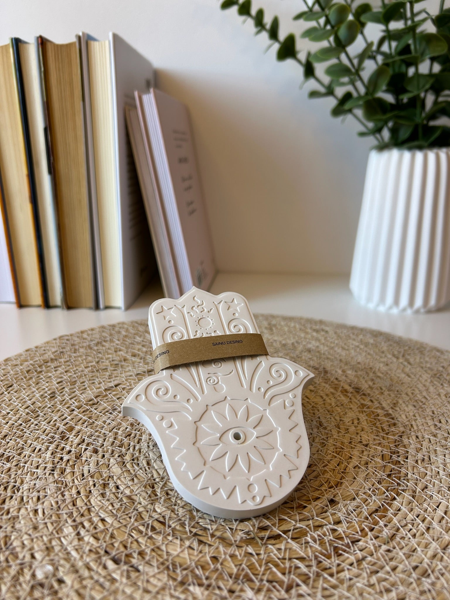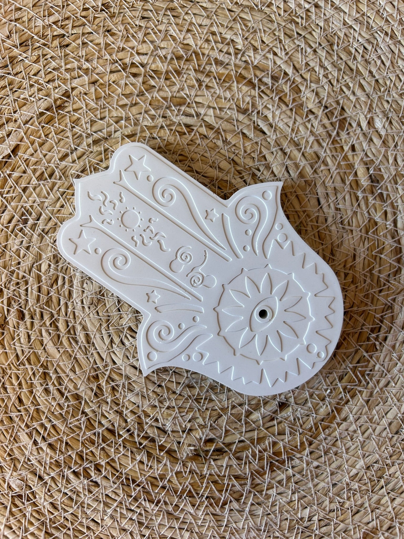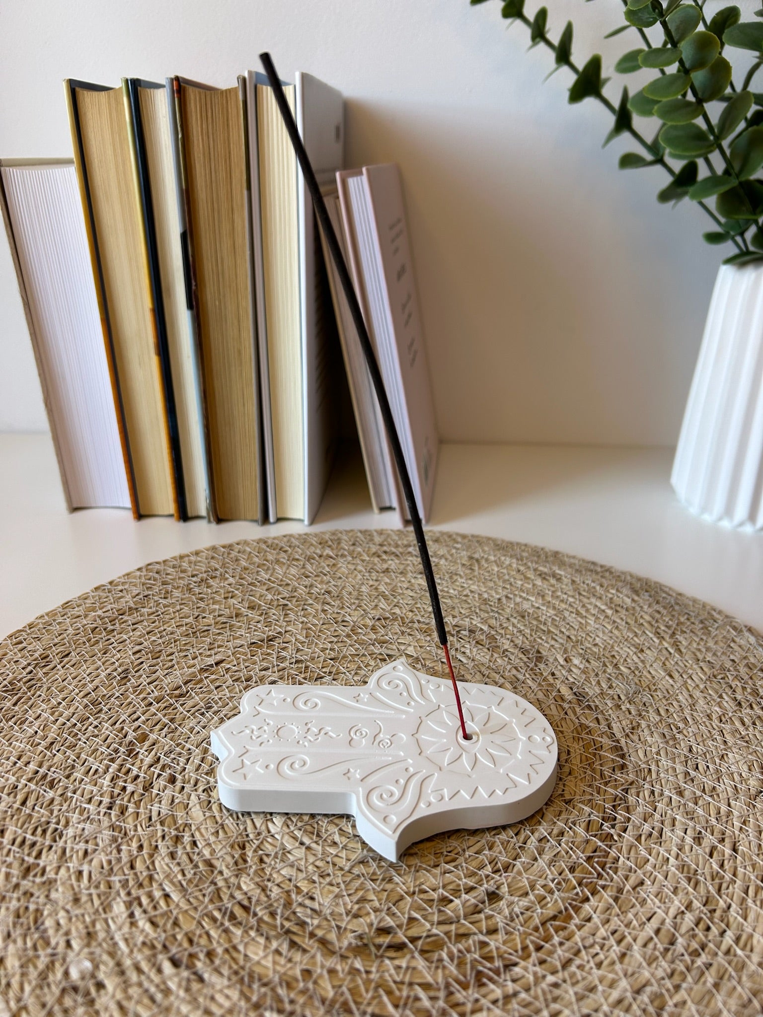 Inspirado en la simbología protectora de la Mano de Fátima, este portainciensos ha sido diseñado para aportar calma, equilibrio y un toque decorativo especial a tus espacios. Su forma delicada y elegante lo convierte en mucho más que un accesorio funcional: es una pieza única de diseño artesanal.
