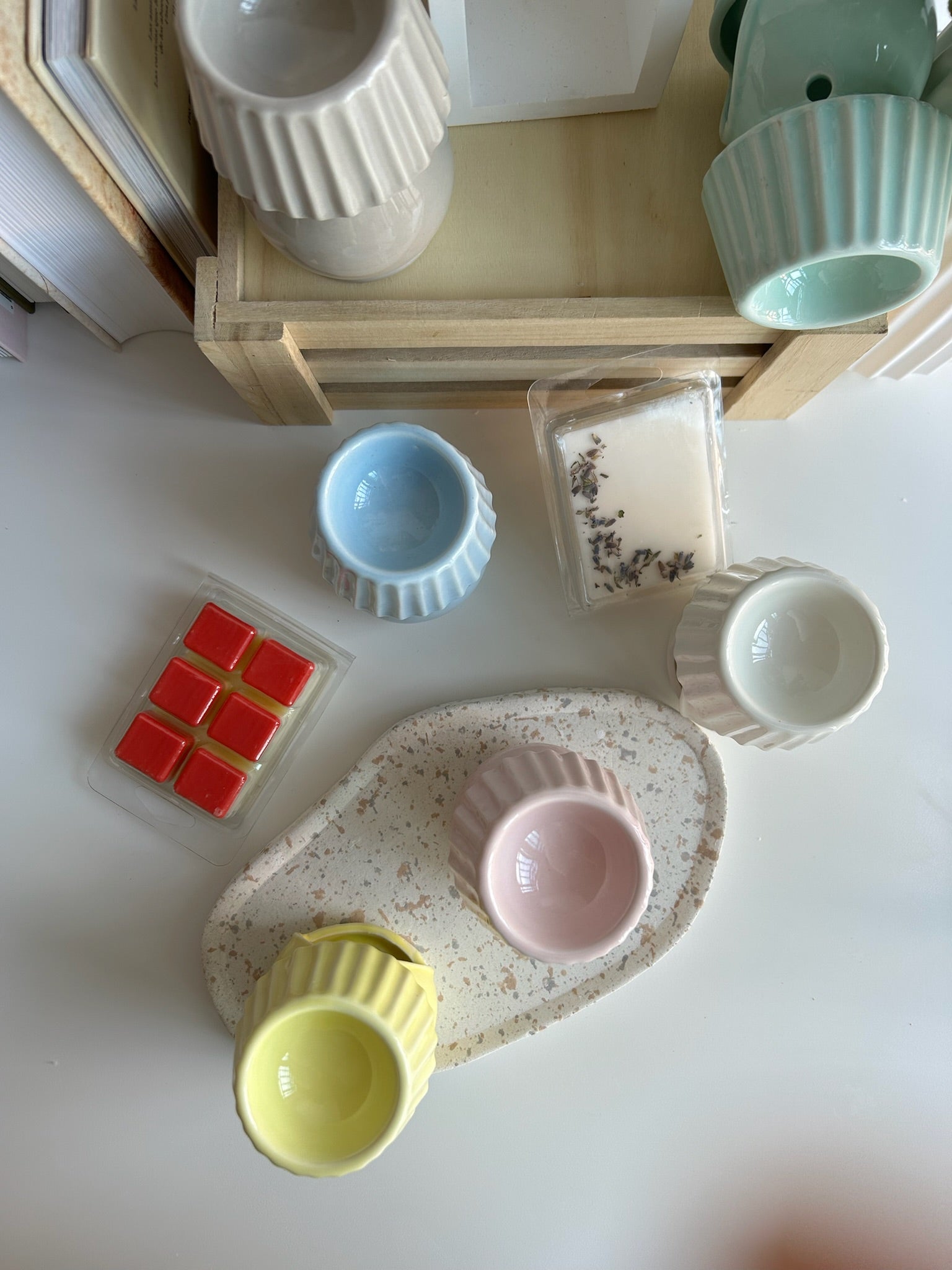Los wax melts son tabletas de cera aromática que se derriten en un quemador sin necesidad de mecha. Solo debes colocarlos en la parte superior del quemador para que el calor libere el aroma. Al no quemar la cera directamente con la mecha, el aroma es más rápido e intenso.