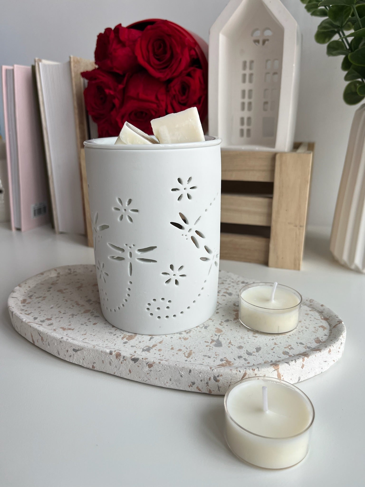 Nuestro quemador de cera con delicadas libélulas es una pieza llena de encanto y luz. Al encenderlo, la luz se filtra suavemente a través de sus alas, proyectando destellos mágicos que transforman el ambiente en un rincón de calma y belleza. Ideal para acompañar tus momentos de relax con un toque de elegancia y serenidad. 🕯️🪶