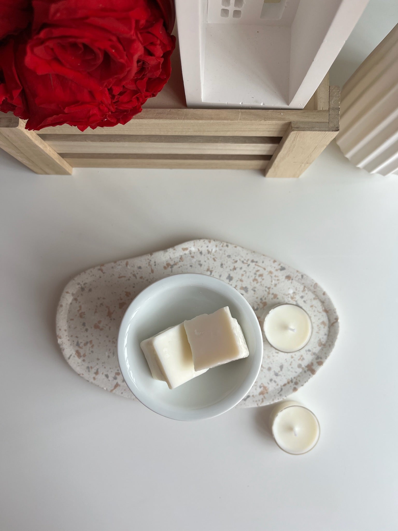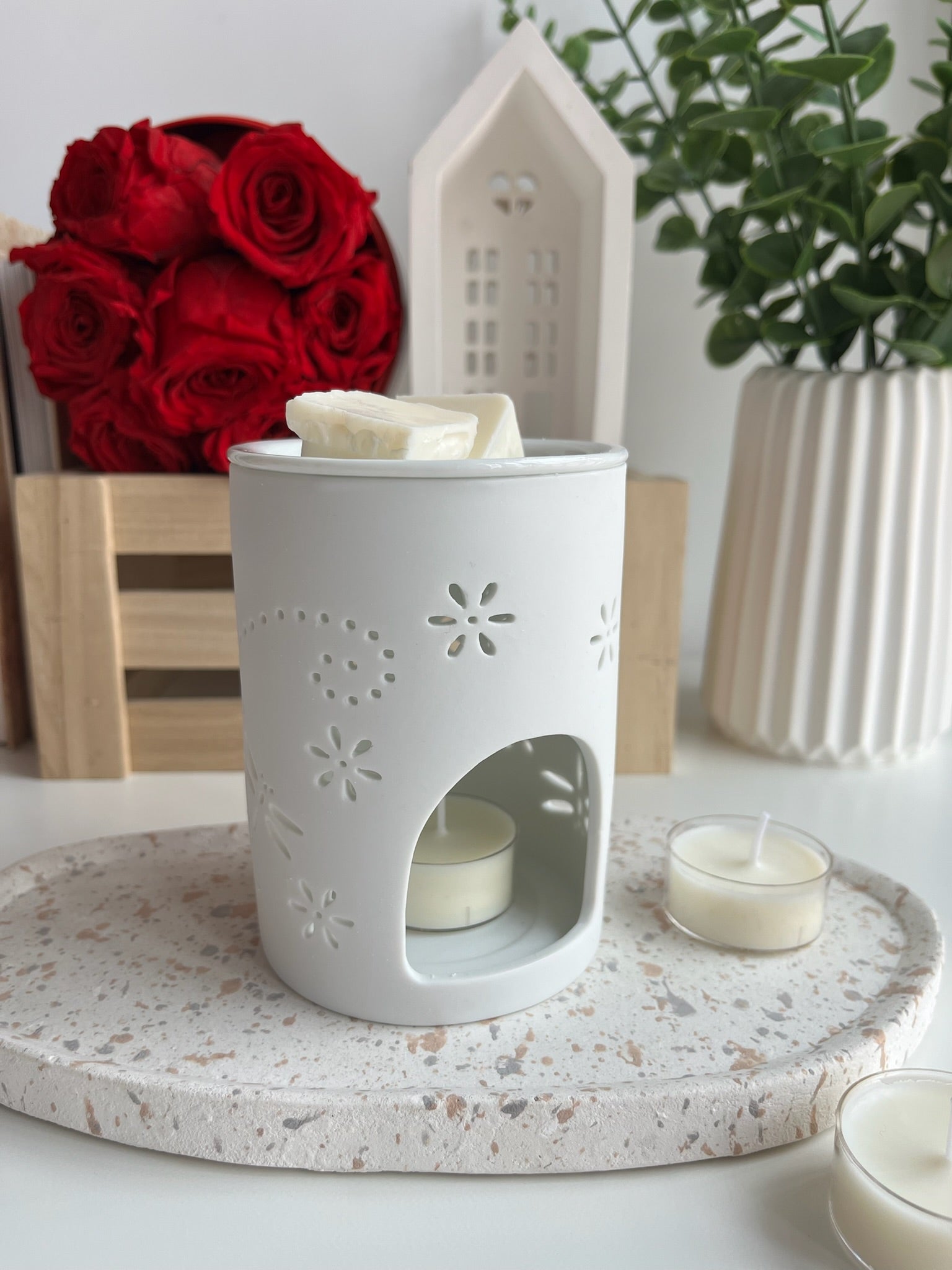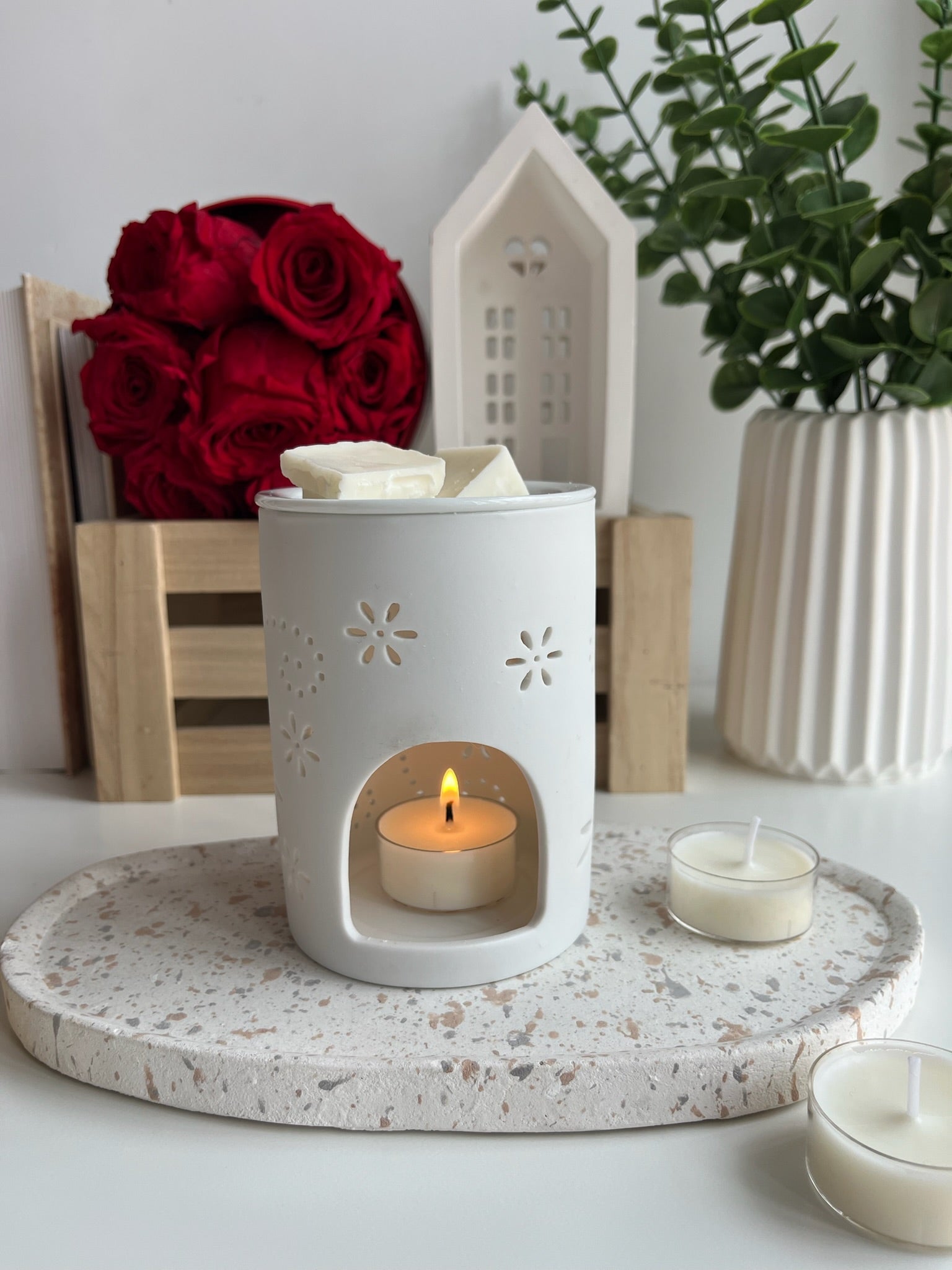 Los wax melts son tabletas de cera aromática que se derriten en un quemador sin necesidad de mecha. Solo debes colocarlos en la parte superior del quemador para que el calor libere el aroma. Al no quemar la cera directamente con la mecha, el aroma es más rápido e intenso.