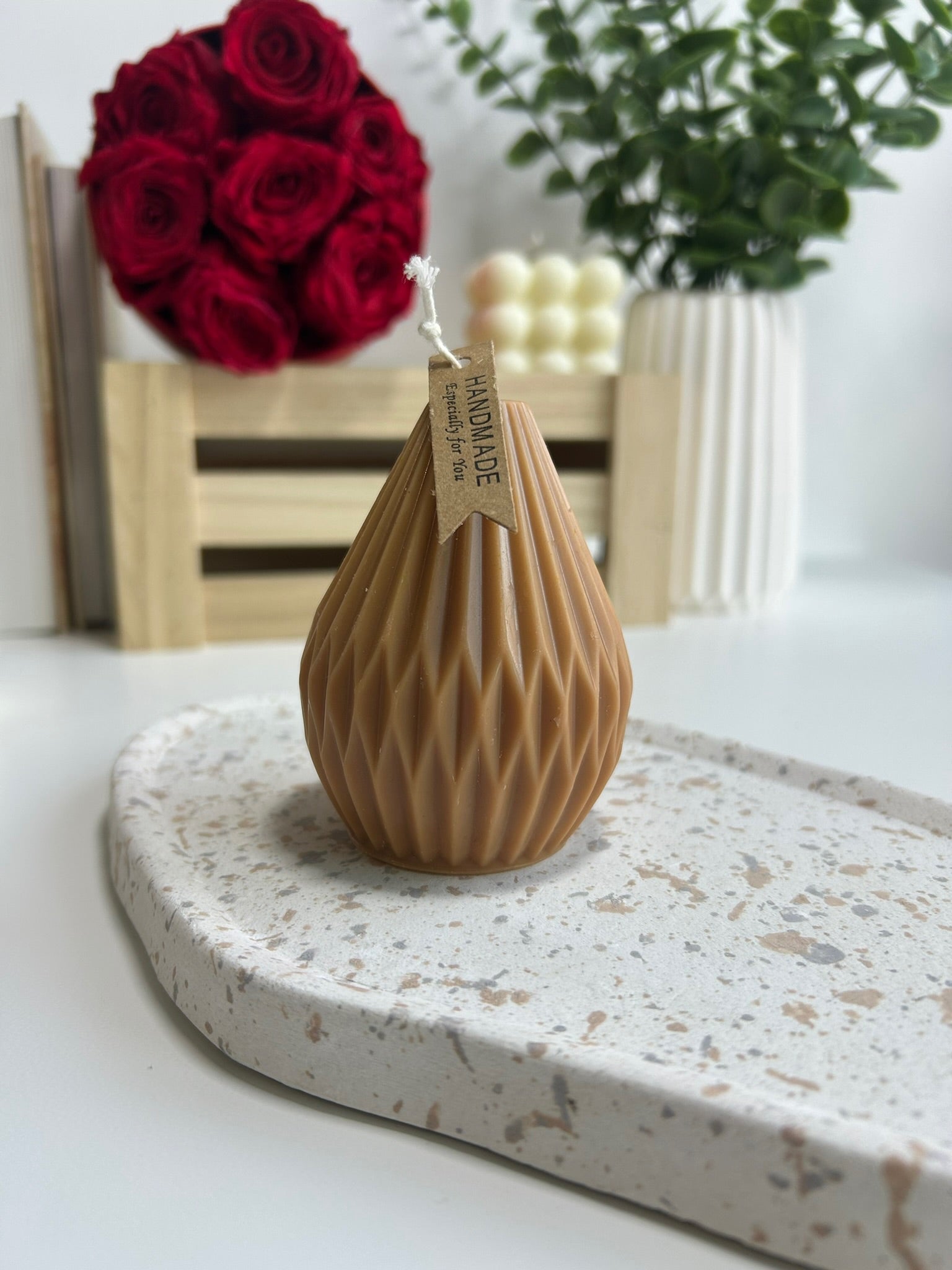 Añade un toque de calidez y diseño a tu espacio con nuestra vela artesanal en forma de lágrima. Elaborada a mano con cera de alta calidad, esta pieza destaca por su delicado relieve geométrico que aporta un estilo moderno y sofisticado a cualquier ambiente.